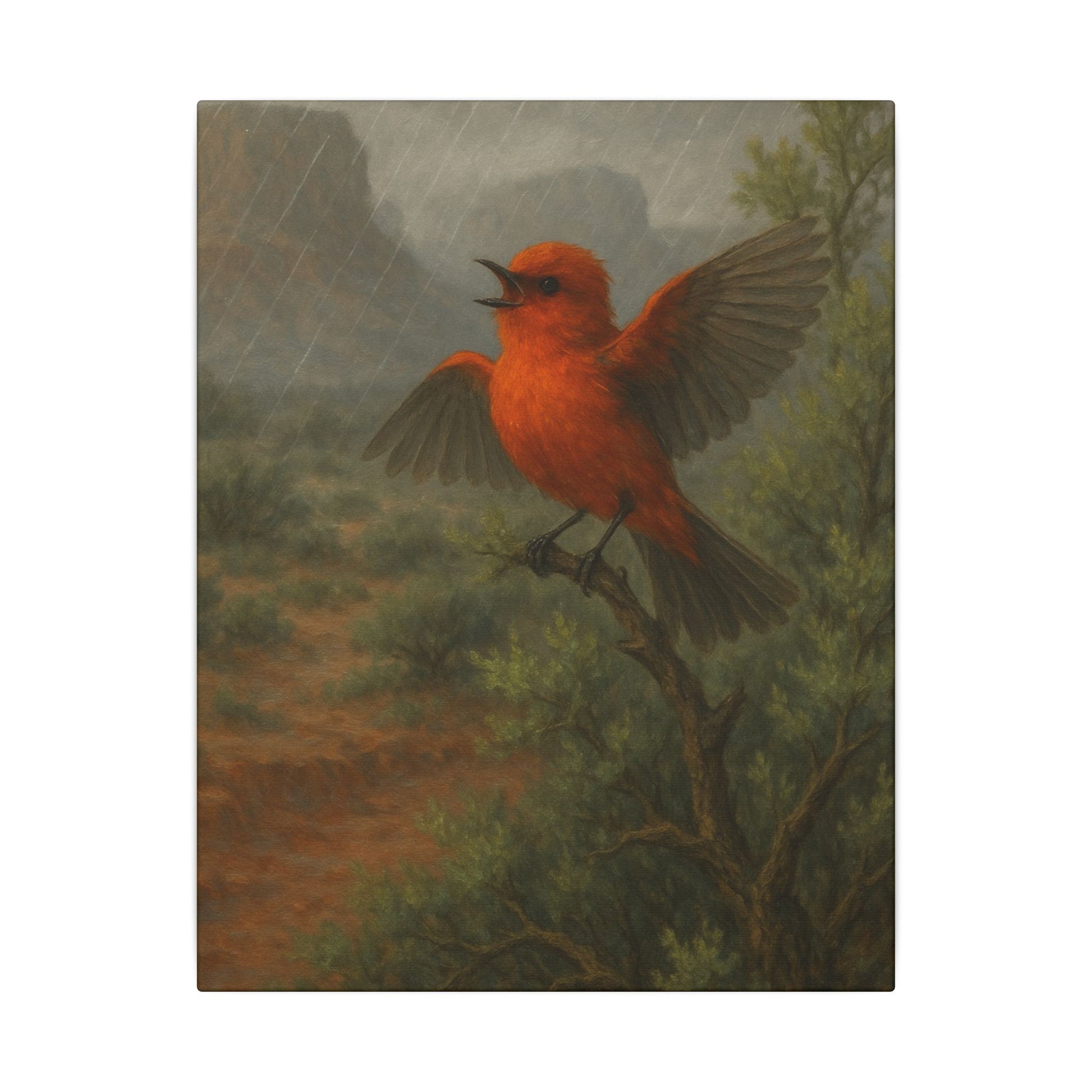 Rainy desert canvas print featuring a red bird singing during an Arizona rainstorm. Perfect for nature lovers and those who appreciate calm nature artwork. Ideal for adding a pop of color to any room or as a thoughtful gift for bird enthusiasts. Suitable for decorating homes, offices, or nature-themed spaces.